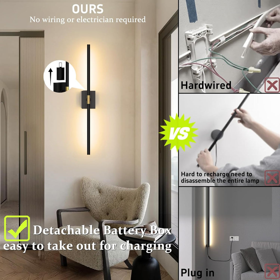 【360° Illumination & Versatile Decor】Elevate your home with iThird's 31.5-inch battery-operated wall sconces, designed to blend 360° adjustable lighting with modern elegance. This sleek black sconces wall decor set of 2 combines practicality and style, perfect for TV walls, vanity mirror, bedrooms, living rooms, hallways, bathrooms, staircases, fireplaces, and pictures