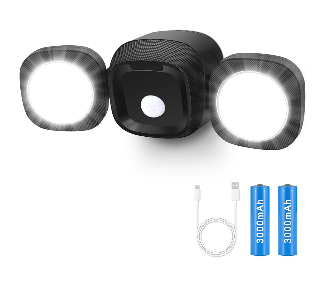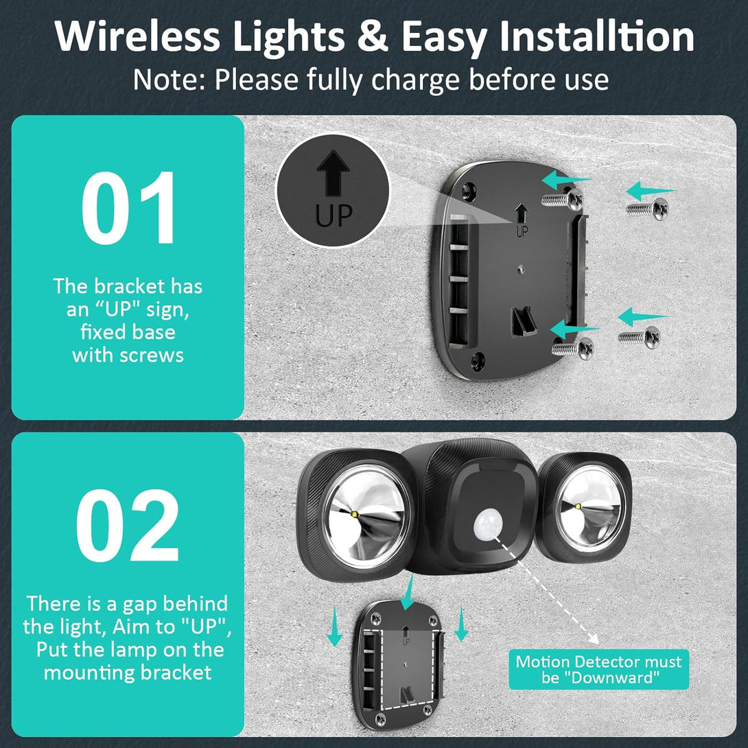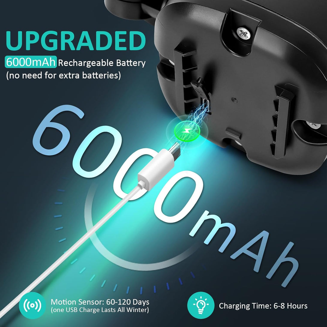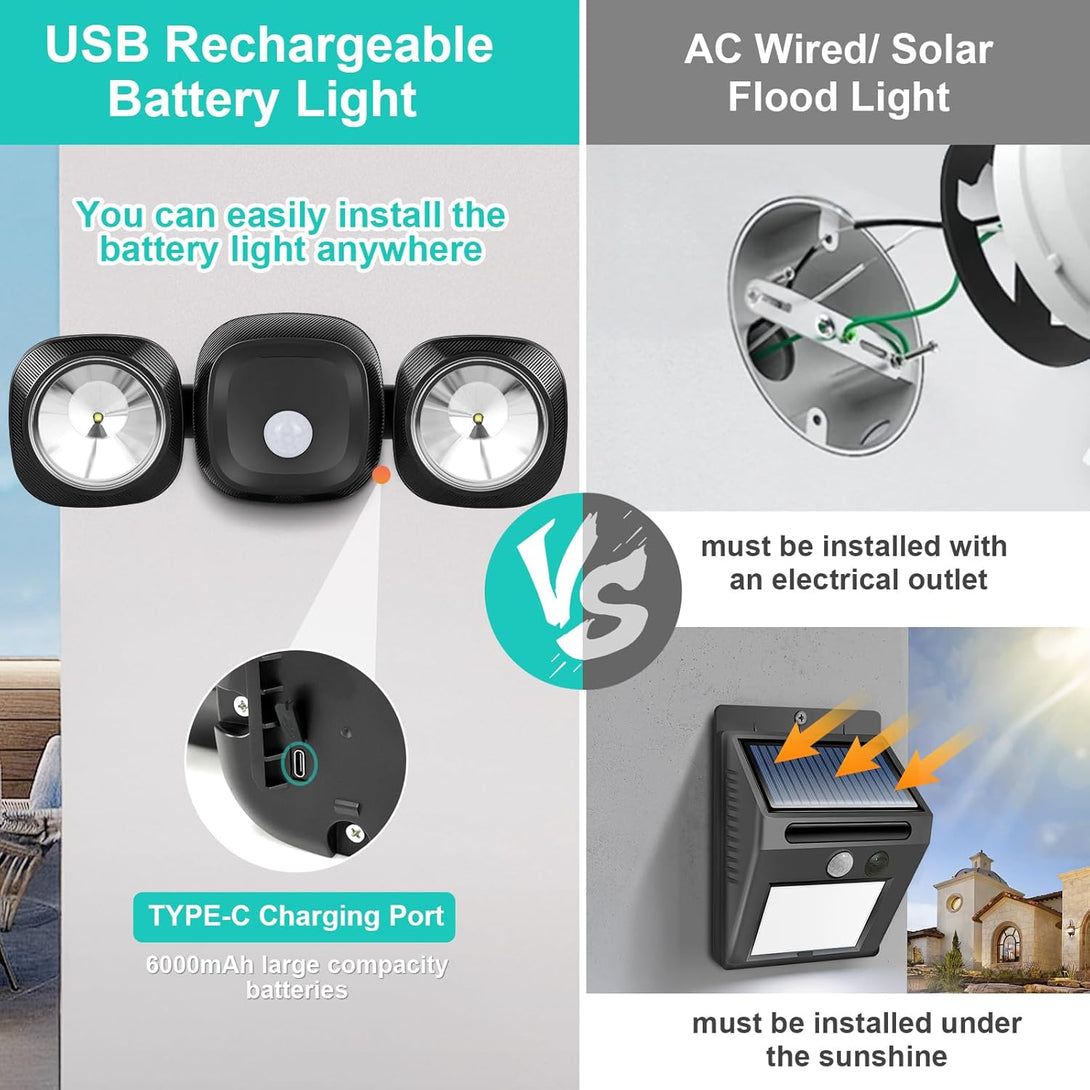 - 【Rechargeable Motion Sensor Lights】NO NEED TO BUY EXTRA BATTERIES! Our wireless motion sensor light has built-in 6000mAh rechargeable batteries, Don’t worry about replacing the batteries frequently, recharge the battery motion sensor light outdoor using the included Type-C for 6-8 hours, and up to 4 months of use(The motion detector turns green when fully charged)