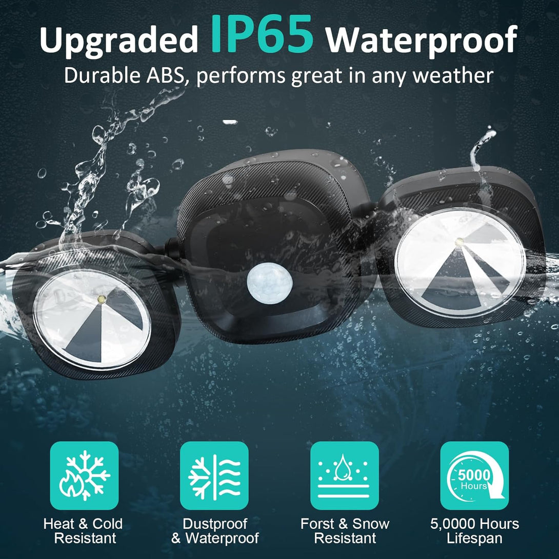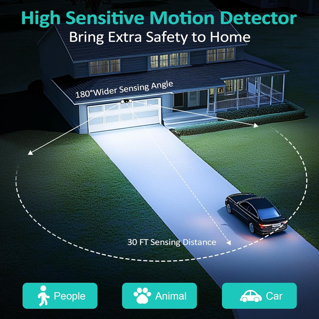 - 【Sensitive Motion Sensor Light】 The battery powered security lights are equipped with a superior motion sensor, which features a compassionate 180° detection angle and 30ft detection distance. Even people/cars/animals passing by can trigger the sensor lights for outside in dark conditions, improving your security and keeping you alert at night