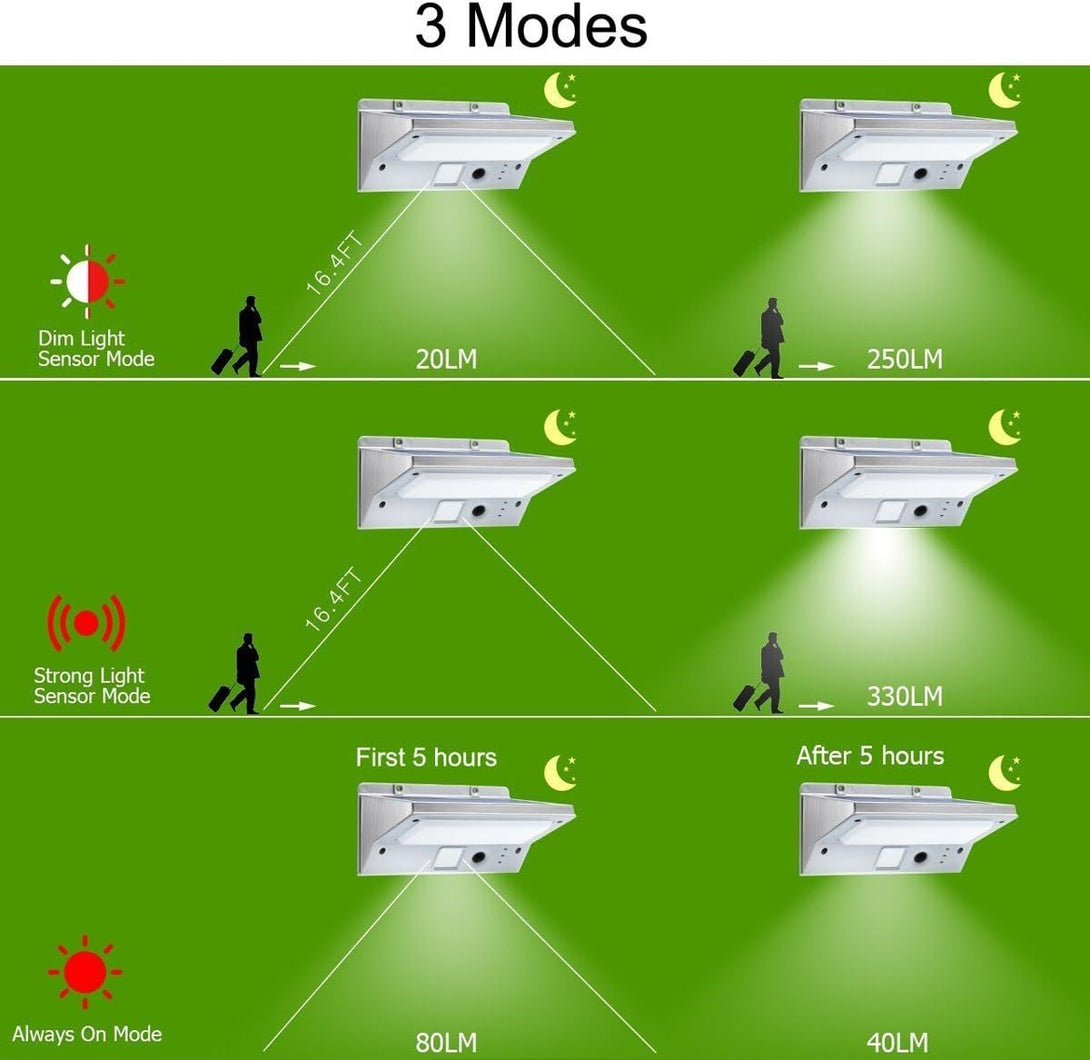 - 3 Modes Solar Motion Sensor Lights Outdoor: 1st mode: the lights will stay on dim when no motion detected and then turn on bright when motion detected; 2nd mode: Stay off when no motion detected and then turn on bright when motion detected; 3rd mode: Stay dim all night