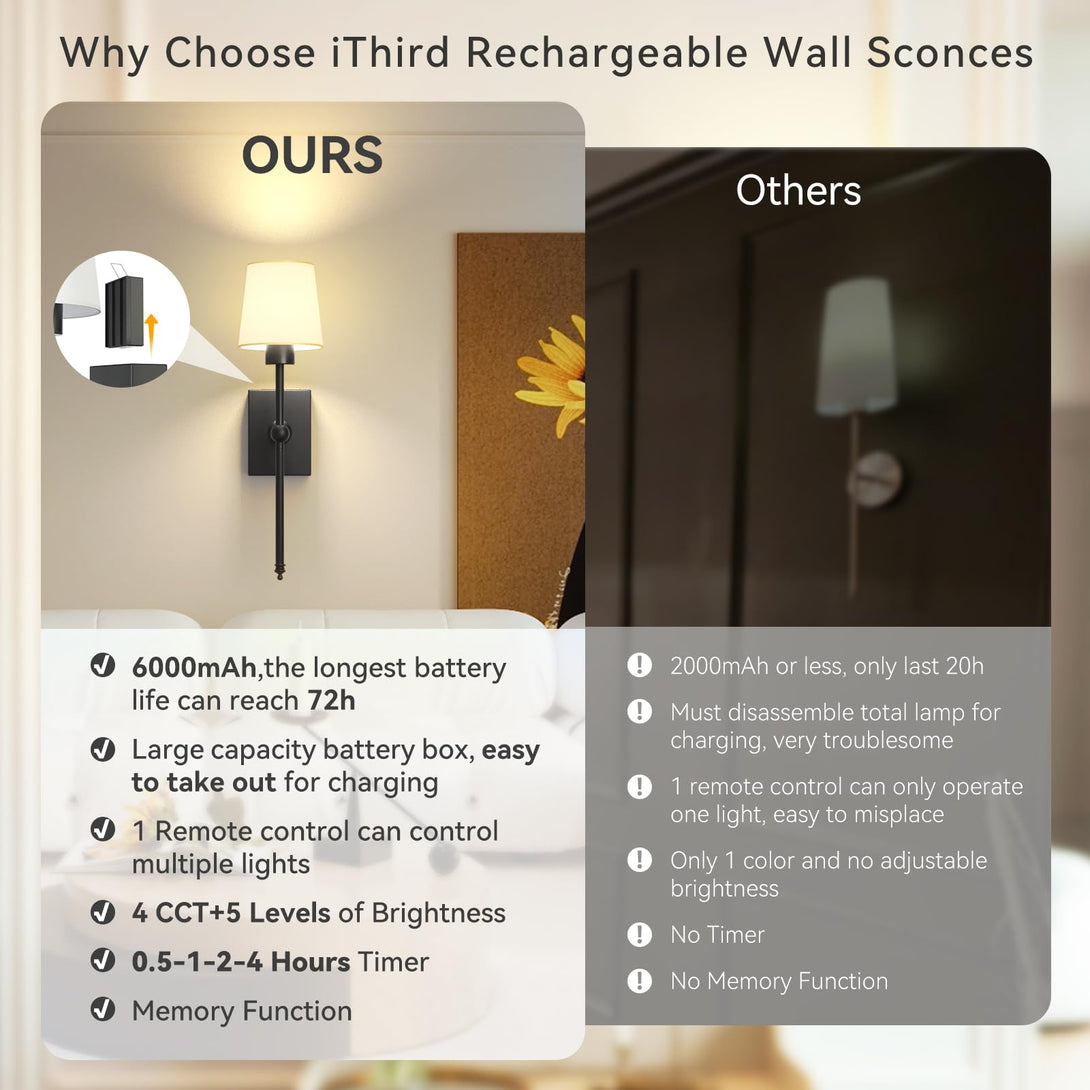 iThird Battery Operated Wall Sconces Set of 2, Black Rechargeable Wall Lights with 6000mAh Detachable Battery and Remote,4CCT Dimmable Wireless Sconce Lamp for Bedroom Living Room Hallway Bathroom