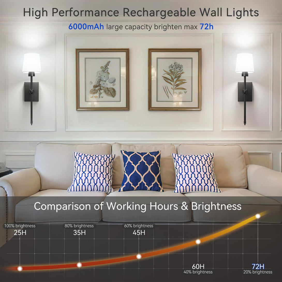 【6000mAh Rechargeable Wall Sconces】Our battery operated wall sconce features a 6000mAh battery(larger capacity than most wall lamps on the market), after fully charged, The battery wall light can last for up to 25 hours at maximum brightness and 72 hours at the lowest setting. It will seamlessly fit into any indoor area, adding function and style while creating a pleasant ambiance with its wireless installation. Plus, you won't have to worry about power outage